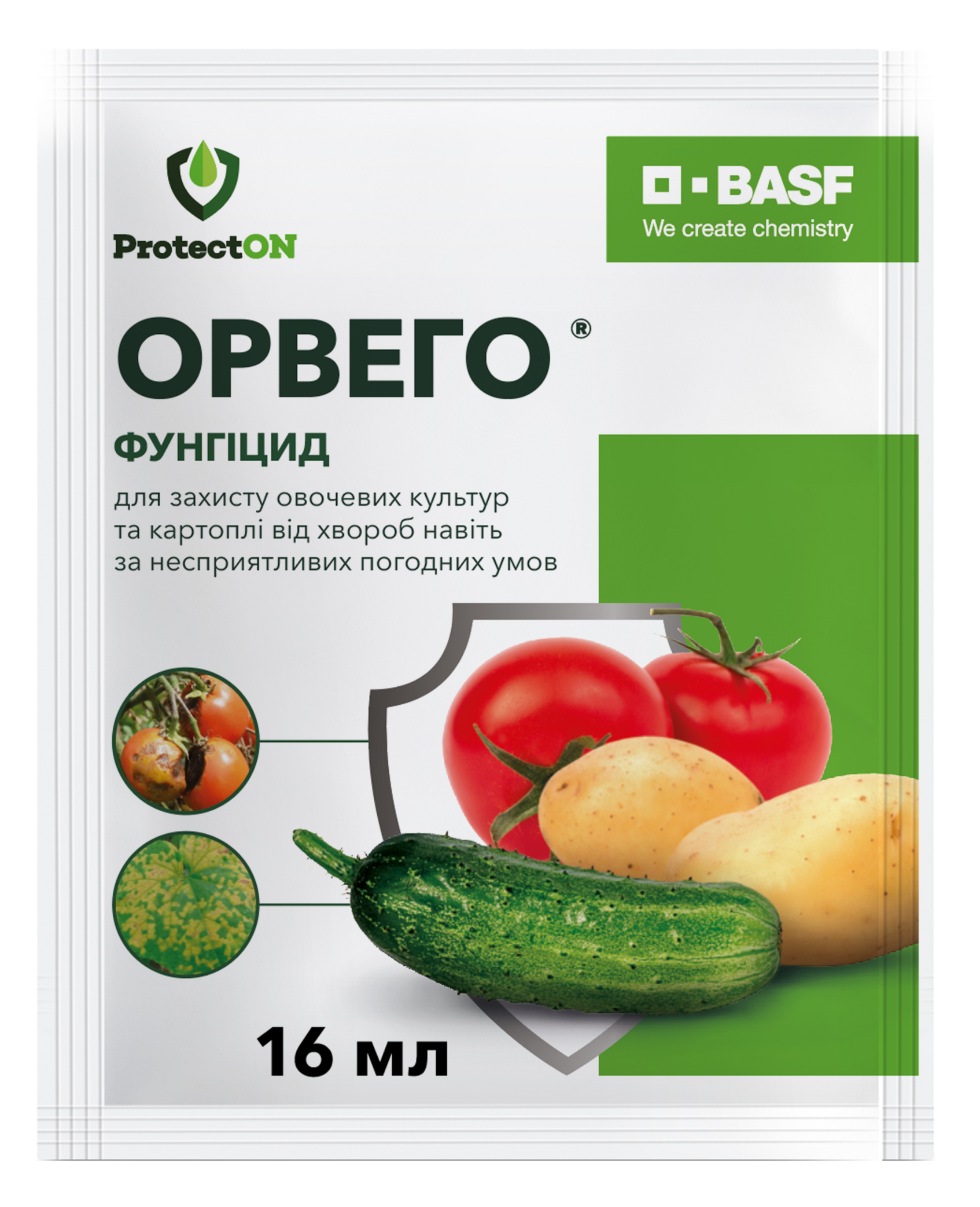 Орвего® — комбінований фунгіцид контактно-системної дії на основі аметоктрадину та диметоморфу, які контролюють фітофтороз на різних стадіях розвитку патогену. Аметоктрадин закріплюється у восковому шарі листка, утворюючи стійкий зовнішній захисний екран і запобігаючи утворенню та проростанню зооспор. Завдяки утворенню захисних “депо”, діюча речовина поступово вивільняється, забезпечуючи тривалий профілактичний захист. Диметоморф швидко проникає в тканини рослини, пригнічує розвиток міцелію та проростання спорангіїв, забезпечуючи внутрішній захист і лікувальну дію. Разом компоненти забезпечують профілактичний, лікувальний та антиспоруляційний ефекти й знижують ризик розвитку резистентності. Однією з особливостей препарату є те, що під впливом вологи (наприклад, роси або дощу) частинки фунгіциду Орвего® поступово вивільняються, що сприяє підтриманню високого ступеня захисту.